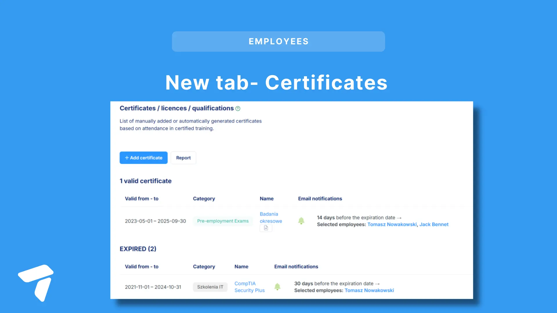 In each employee’s profile, we’ve added a Certificates tab. This allows you to store an unlimited number of certificates for every employee.