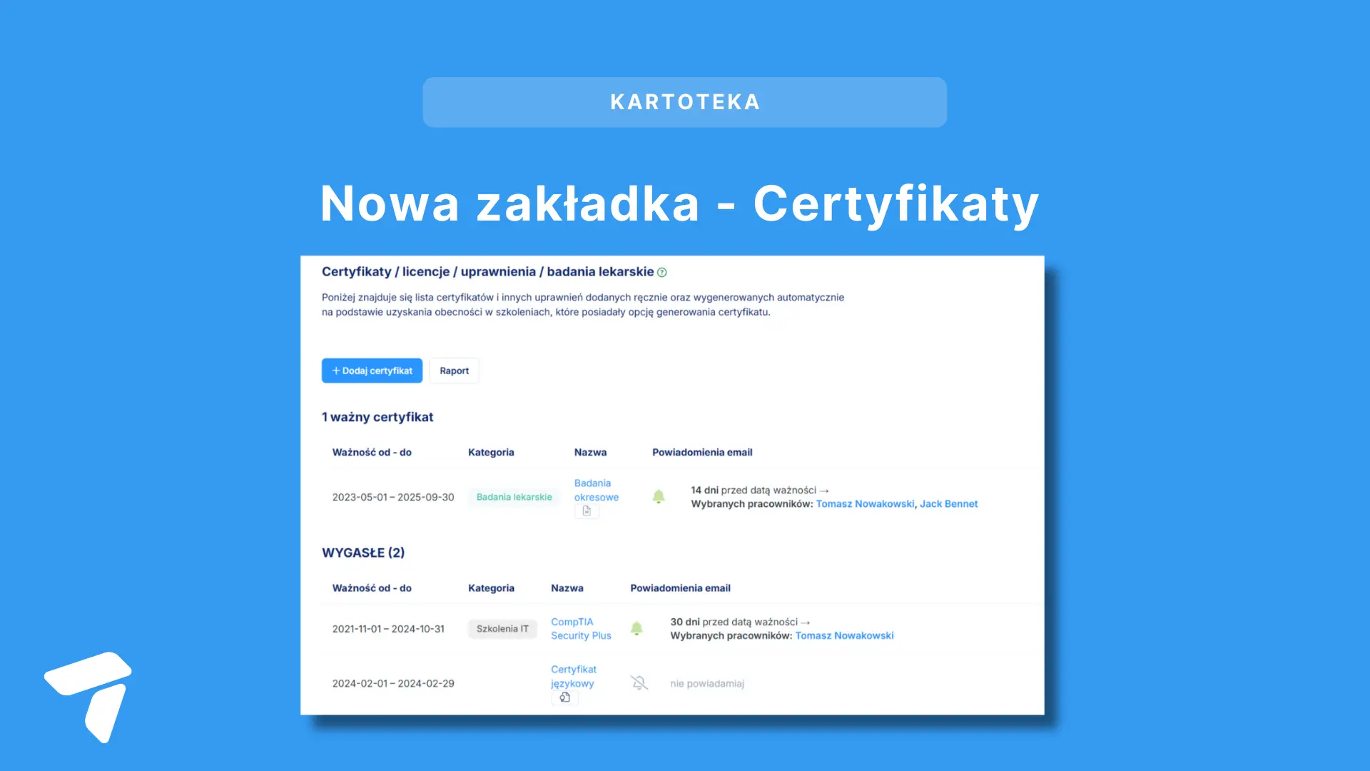 W profilu pracownika stworzyliśmy zakładkę Certyfikaty. Pozwala ona na umieszczenie dowolnej ilości certyfikatów dla każdego pracownika.